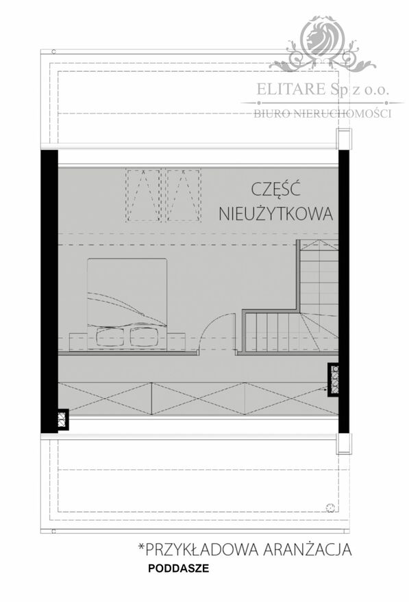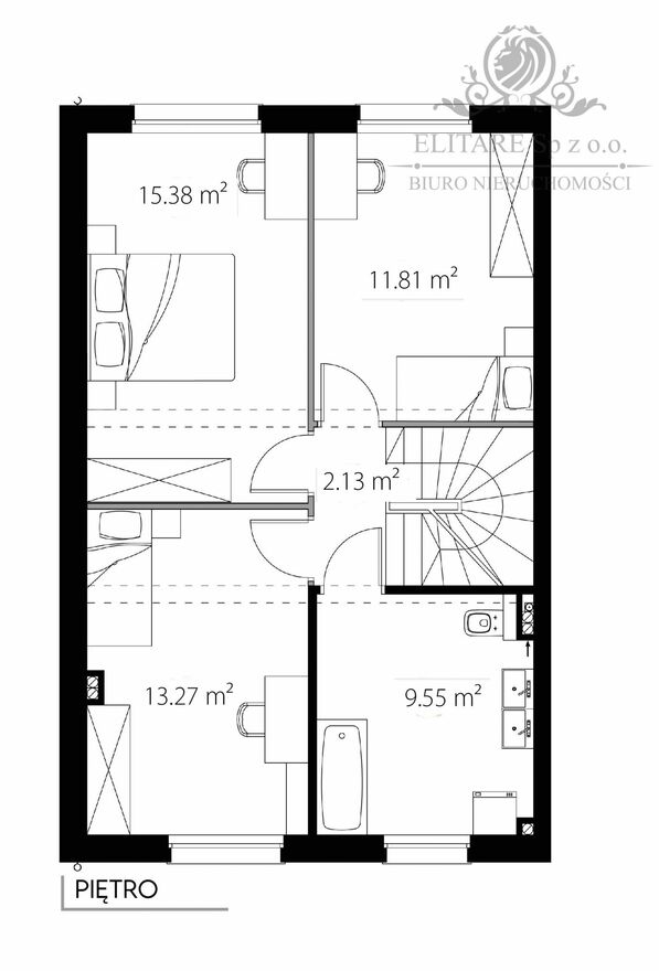 PIĘTRO to strefa pracy i nocna, gdzie mamy 3 oddzielne pokoje o powierzchniach 15,38m2, 13,27m2 i 11,81m2 oraz duża łazienka o powierzchni 9,55m2. Na tym poziomie również mamy schody techniczne prowadzące na poddasze o powierzchni dodatkowej + 16,84m2 (nie ujętej w powierzchni użytkowej domu). W domach brak jest schodów wewnętrznych na I piętro i poddasze nieużytkowe (są do wykonania w zakresie nabywcy), ale w jednym z domów wykonano schody pokazowe, aby w pełni pokazać potencjał nabywanego Domu!